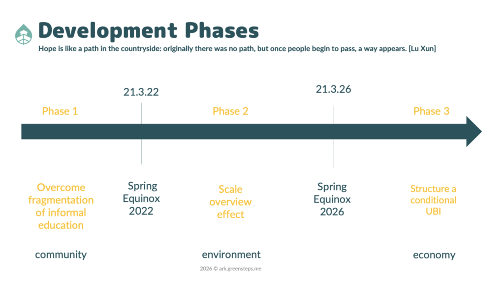 Phase 3 (development kick-off: Spring Equinox 2026) establishes the core infrastructure to operationalize contribution-based systems across bioregions. By redesigning how societies recognize value, organize participation, and distribute resources, the ARK directly addresses the intertwined crises of anomie, inequality, and ecological breakdown — enabling resilient, inclusive, and post-labor social systems.